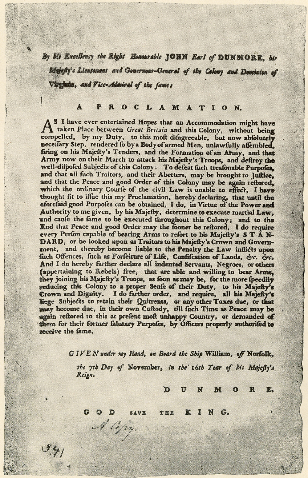 The first document is a printing of Lord Dunmore’s Proclamation, which declared martial law in the Virginia colony. It also offered a promise of freedom to any enslaved person or indentured servant who agreed to fight for the British army.